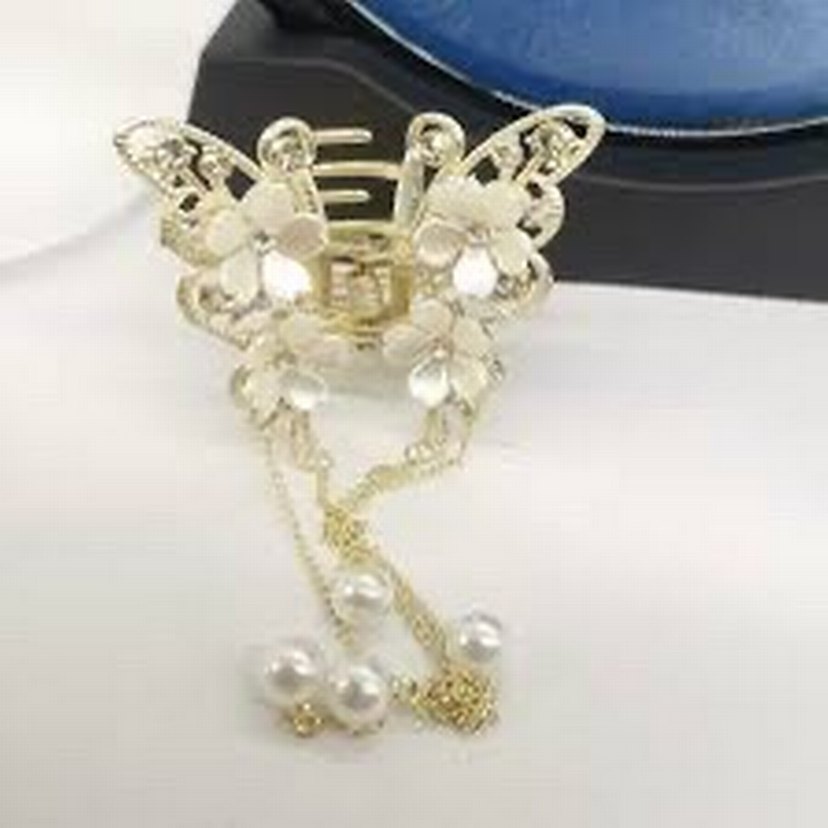 İnci boncuklarla süslenmiş beyaz kelebek toka, hafif altın detaylarla bohem ve zarif bir görünüm sunar.