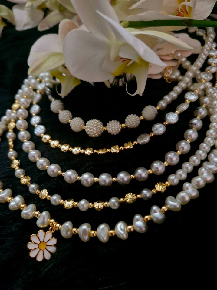 Beyaz boncuklar ve altın detaylarla süslenmiş inci kolye