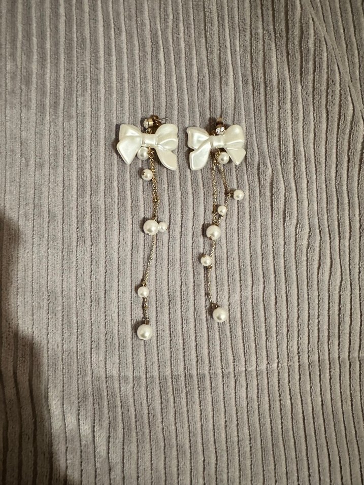Beyaz fiyonk ve nakış detaylı, incili boncuklarla süslenmiş midi uzunlukta bohem stilde küpeler.