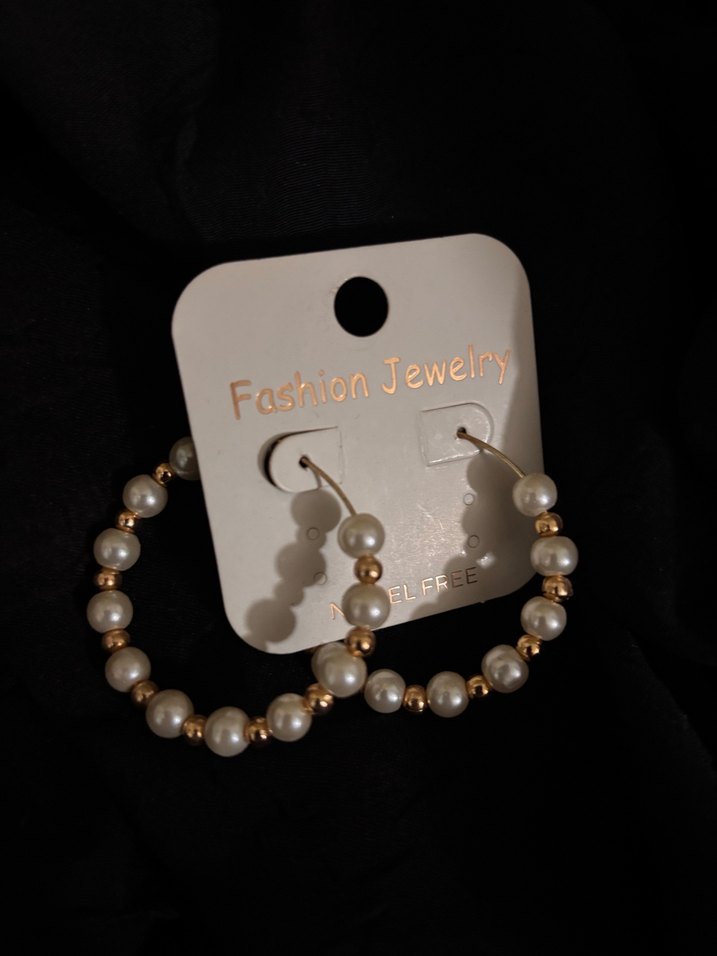 Beyaz boncuklarla süslenmiş midi uzunlukta halka küpeler, günlük sokak tarzı için uygundur. ✨✨