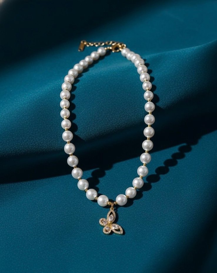 Beyaz boncuklu, normal uzunlukta ve işlemeli kelebek uçlu kolye. Bohem Paris tarzını klasik zarafetle yansıtır, günlük kullanıma uygundur.