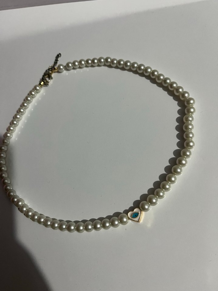 Kadınlar için beyaz boncuklu inciler ve kalp figürü içeren, minimal ve bohem tarzda, romantik akşamlar için uygun midi uzunlukta kolye.