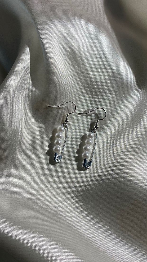 Beyaz boncuklarla süslü, inci görünümlü boncukların parlak gümüş renkli emniyet iğnesi tasarımında kullanıldığı midi uzunlukta küpeler. Minimalist ve gotik tarzları günlük kullanım için birleştirir.✨