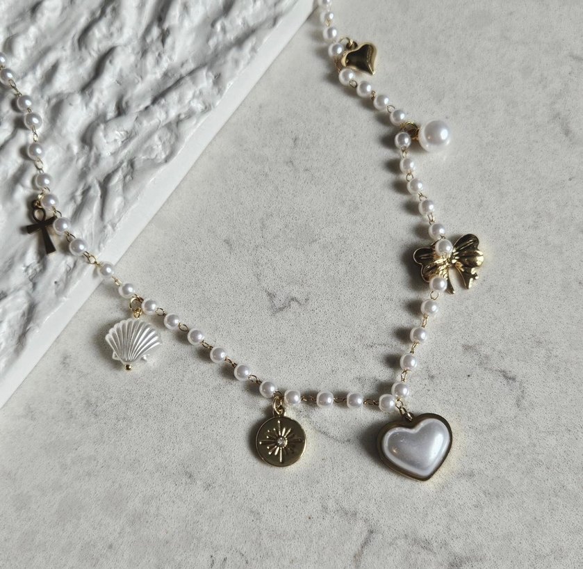 Beyaz boncuklu inciler ve kalp, deniz kabuğu, kelebek gibi altın detaylı figürler içeren kısa boy bohem tarzı kolye. Günlük kullanım için uygundur.
