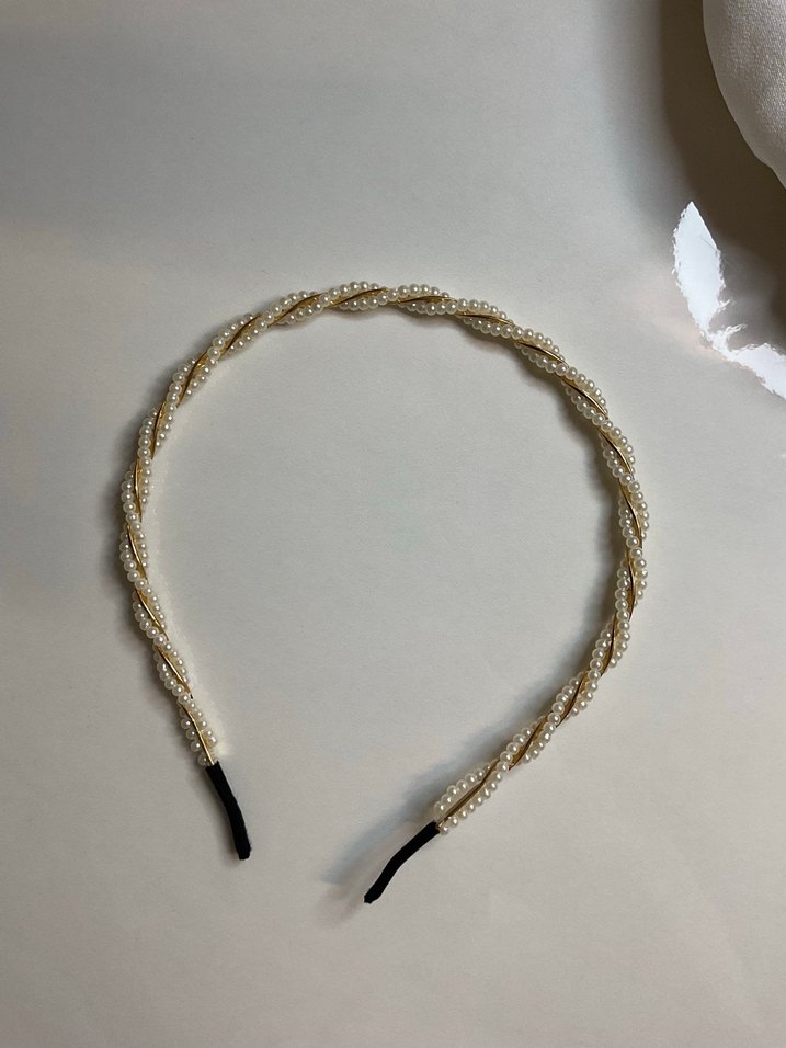 İnci boncuklarla örülmüş beyaz örgü taç, minimal ve hafif vintage bir tarz sunar.