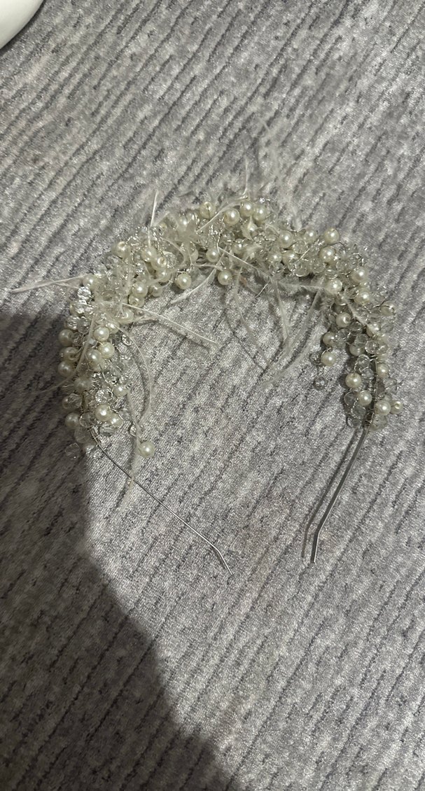 Beyaz örgü kumaştan, boncuk ve incilerle süslenmiş, bohem ve göz alıcı tarzı birleştiren şık saç aksesuarı.