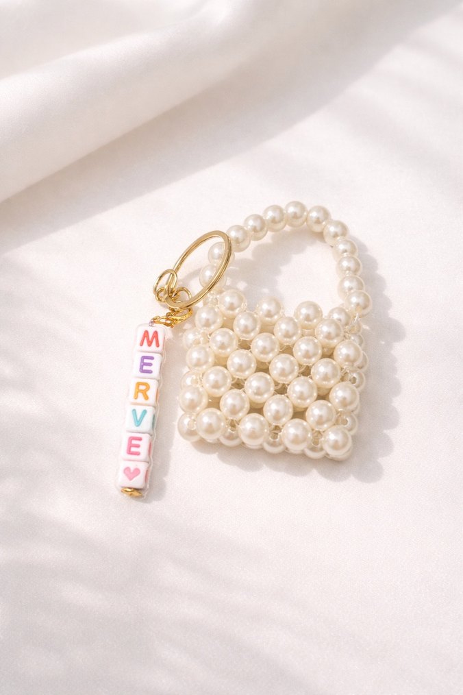 Pastel renkli boncuklardan yapılmış küçük çanta şeklinde kadın anahtarlık, renkli harf boncuklu isimli charm ile tamamlanmıştır. İsimsiz şekilde de yapılmaktadır. Nikah, kına, Mevlüt gibi özel günlerde toplu alımlarda indirim yapılır.