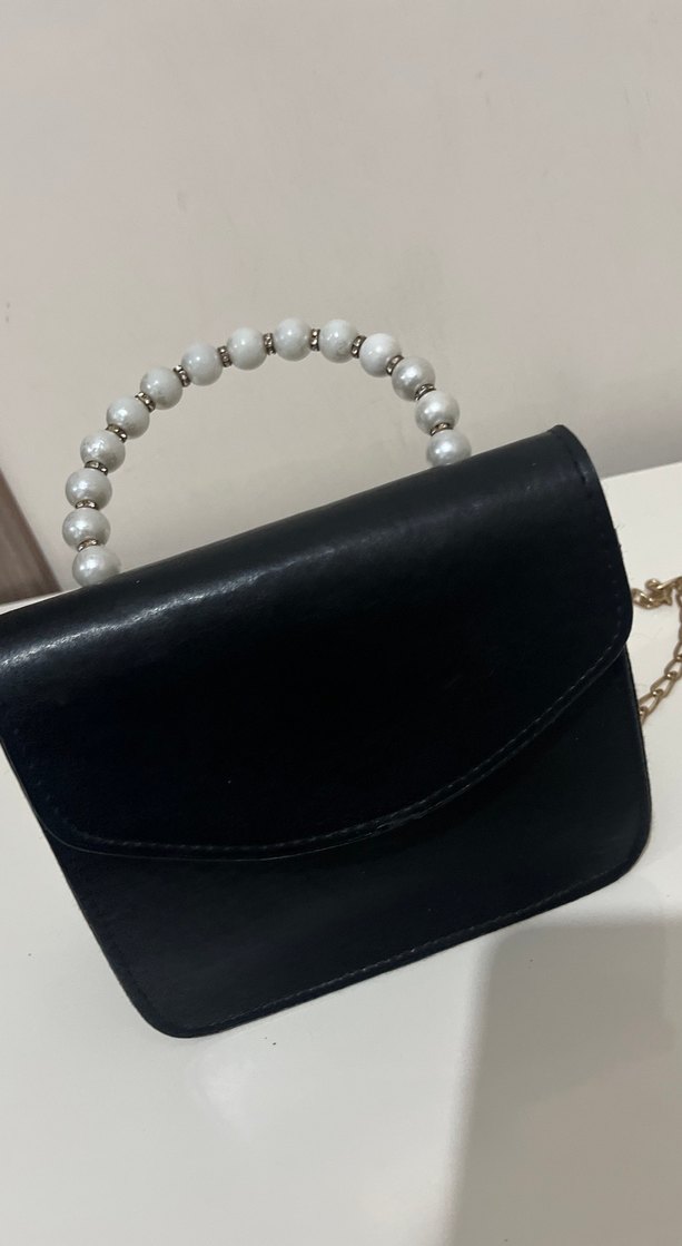 İnci Boncuklu Siyah Deri Kadın Çanta