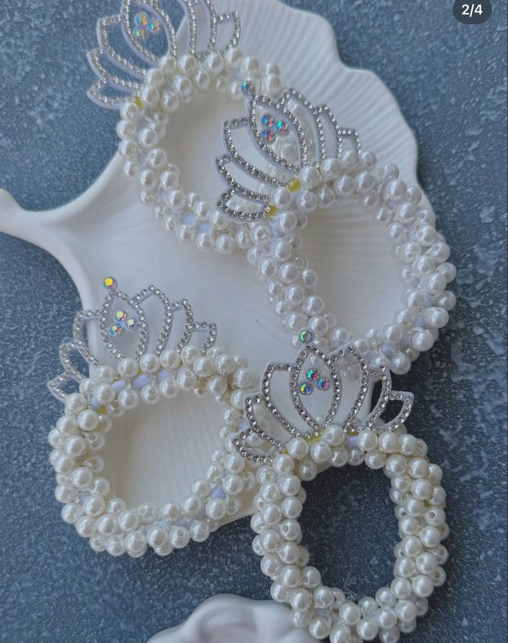Plastik malzemeden yapılmış, inci boncuklu ve taç tasarımlı beyaz saç aksesuarı, klasik zarafeti yansıtır.