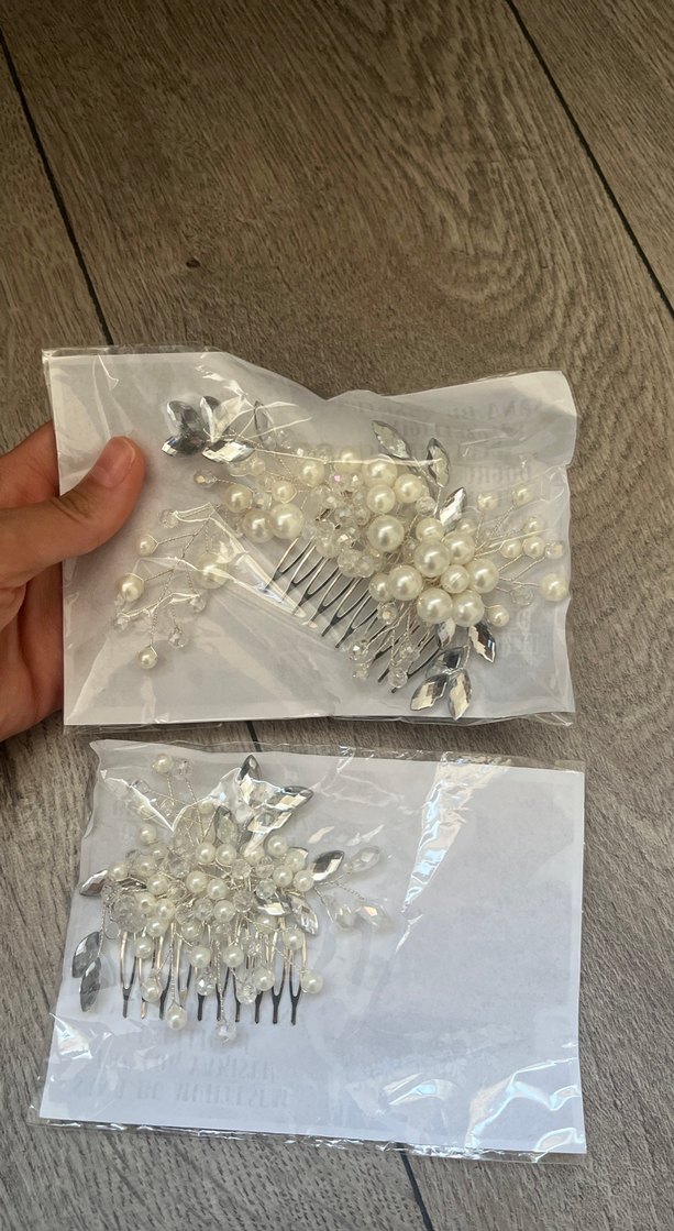 Beyaz ve gri plastik saç tokaları, boncuklu inciler ve gümüş yaprak detaylarıyla vintage bohem tarzını yansıtıyor.