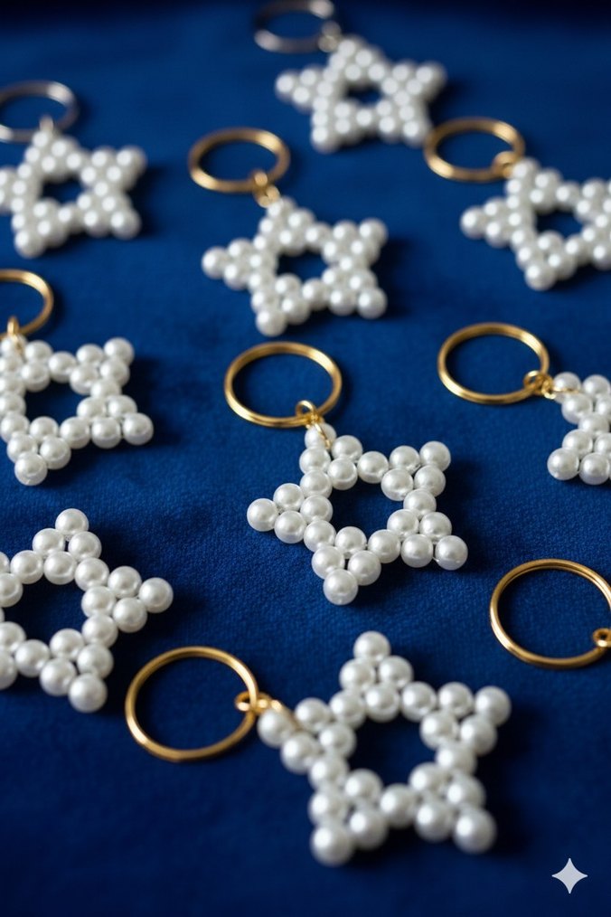 İnci boncuklarla yapılmış yıldız şeklinde, parlak ve altın renkli halka detaylı bohem Paris tarzı anahtarlıklar.