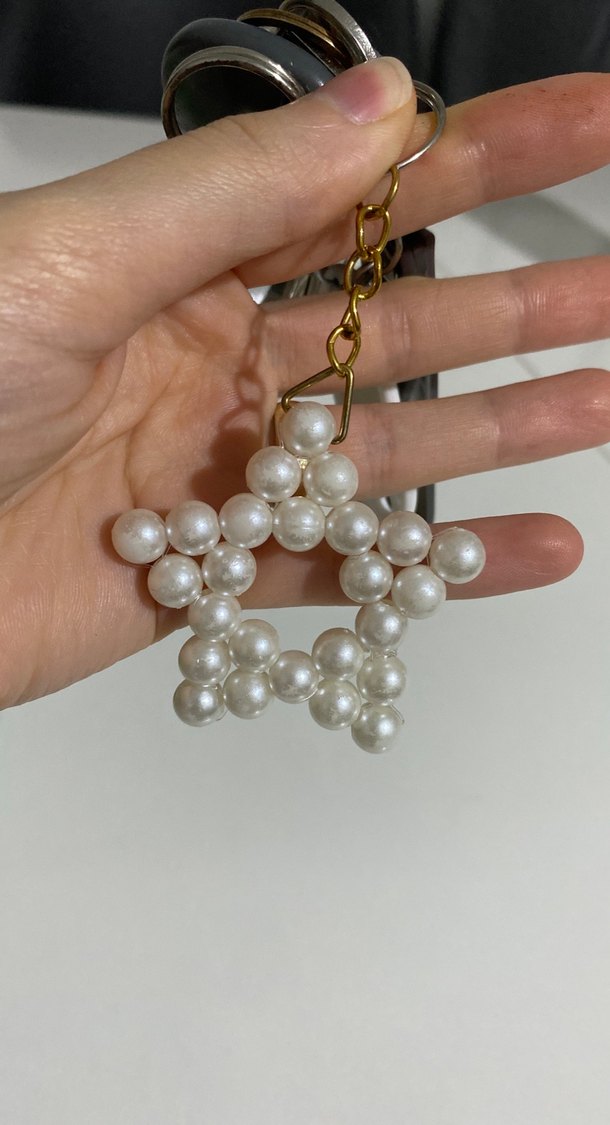Beyaz boncuk incilerden oluşan, yıldız şeklinde minimalist ve bohem tarzda anahtarlık.