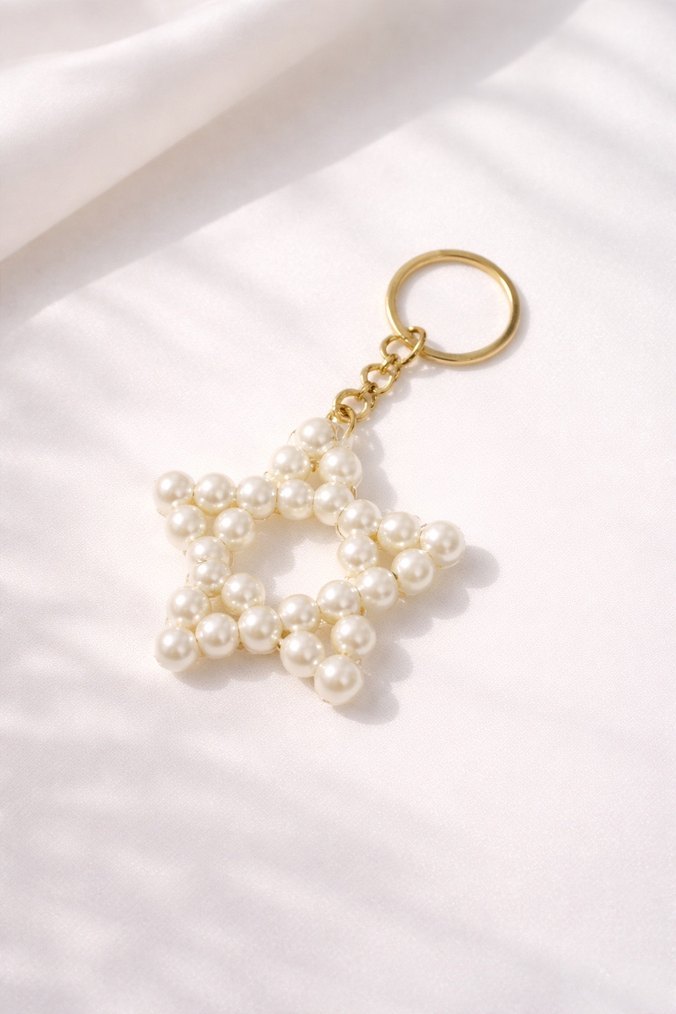 Altın renk halkaya bağlı, inci boncuklardan oluşan yıldız şeklinde bohem ve retro Paris tarzı anahtarlık. ✨ Nikah, kına, Mevlüt gibi özel günlerde toplu alımlarda indirim yapılır.