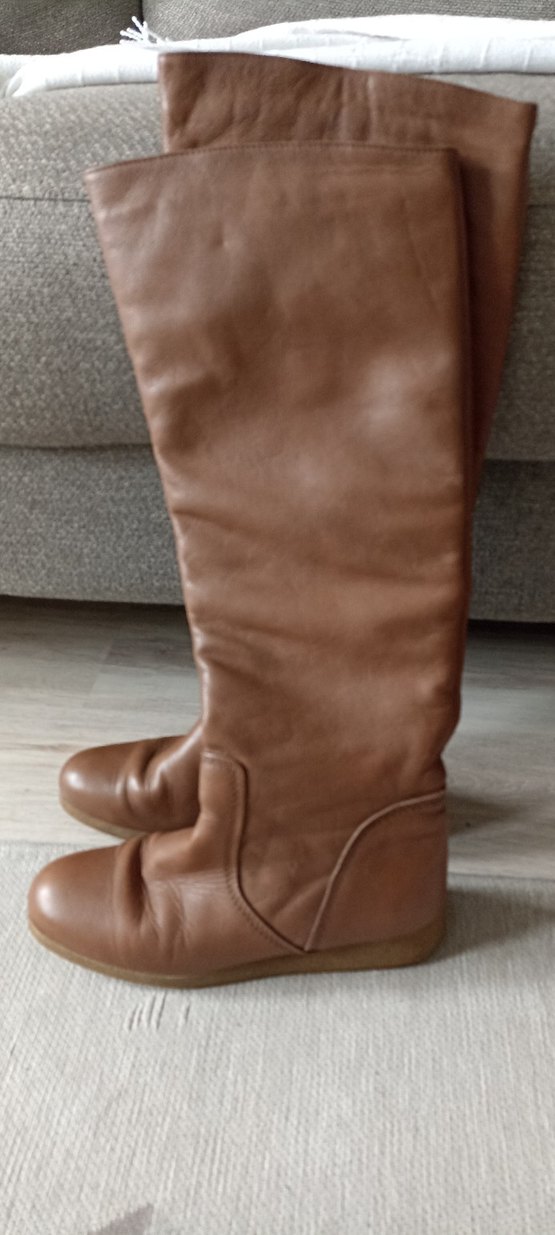 Kahverengi renkte, yumuşak deri malzemeden çizme .Topuksuz, desen içermeyen sade tasarımıyla günlük rahat kullanıma uygun.