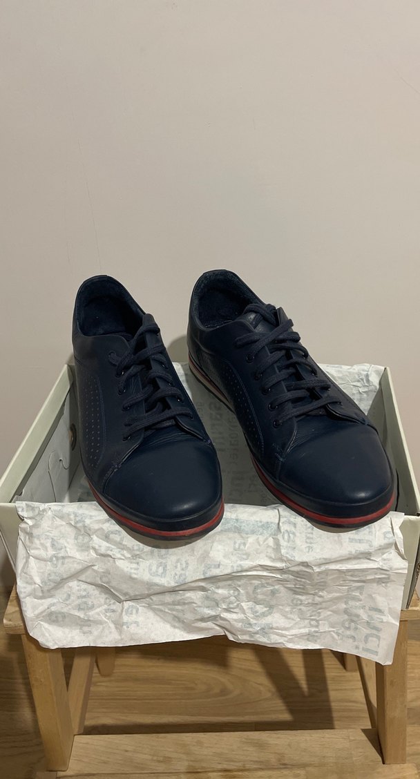 Lacivert renkte, bağcıklı deri ve kauçuk malzemeden üretilmiş erkek klasik spor ayakkabısı. Günlük sokak tarzı ve athleisure stili için uygundur.