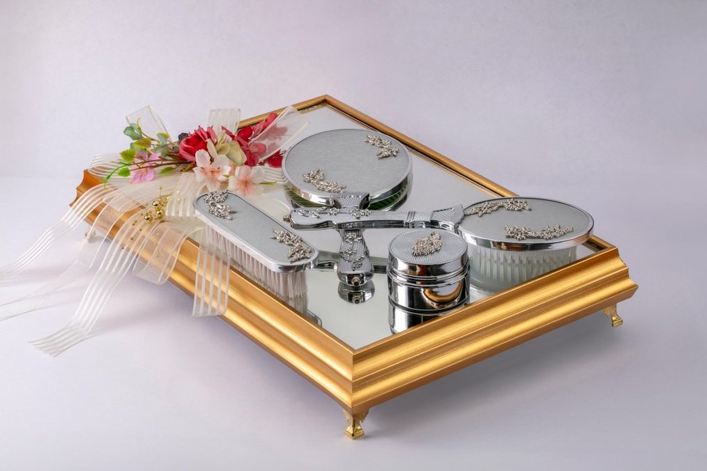 Vintage tarzda, inci detaylı ve parlak altın renginde düğün aksesuar seti; ayna, fırça ve tarak içerir, klasik şıklık için idealdir.
