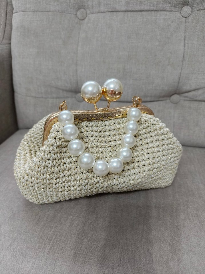 İnci boncuklu kulpu ve altın renkli tokasıyla beyaz örgü kadın çanta. Hafif nakış detayı, modern klasik tarzı yansıtıyor.