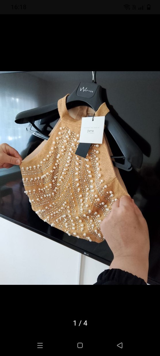 Altın renkli bebek önlüğü, parlak inci görünümlü boncuklarla süslenmiş şık desenli. Yumuşak ve rahat kumaştan yapılmıştır. s m l bedenler mevcut sadece nı renk var başka renk yok bordo satıldı.