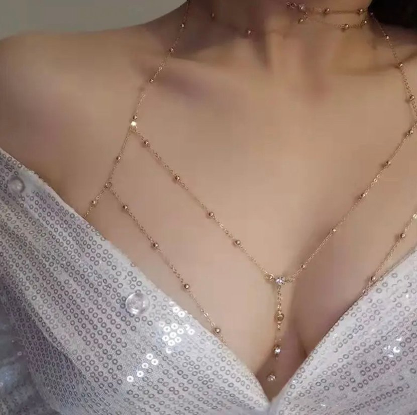 İnci detaylı ve nakış desenli, altın renkli vücut zinciri. Düğünlerde bohem tarzı tamamlar. ✨