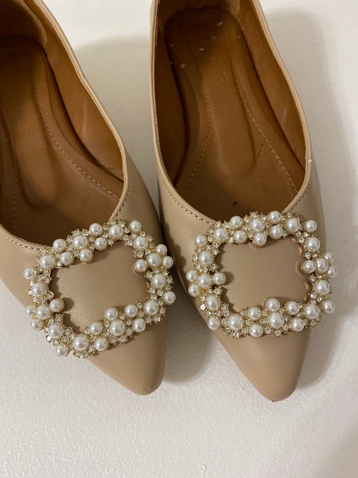Bej kadın babet ayakkabı, inci detaylı tokalı tasarıma sahip. Düğünler için uygun, modern klasik stil. 36 numara 1 kere kullanıldı
