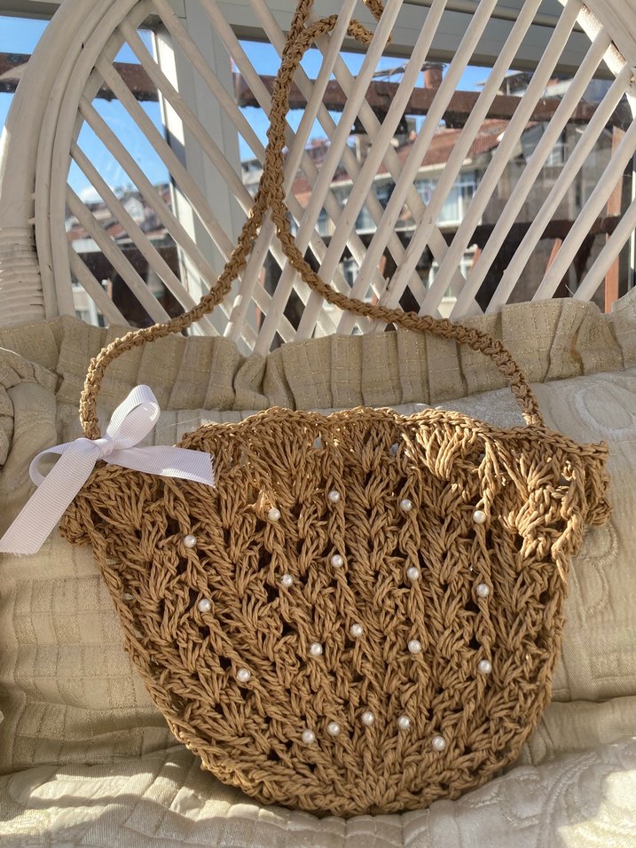 Bej renkli, inci işlemeli ve dantel kurdelesi olan el yapımı hasır çanta astarsızdır marka temsili