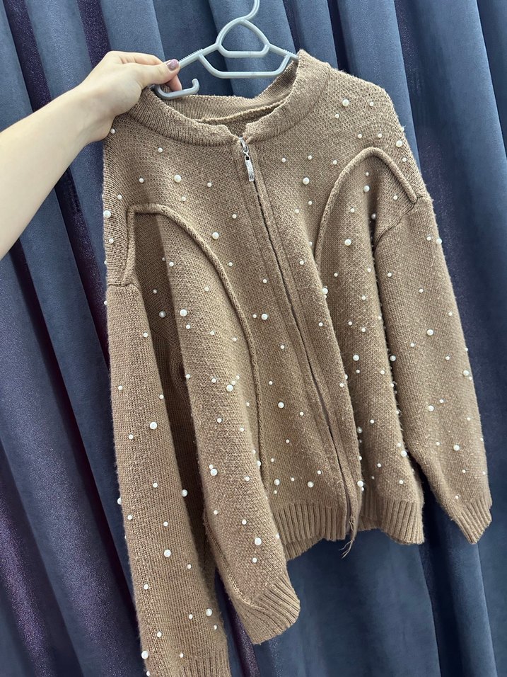 Uzun kollu, bisiklet yaka ve ön fermuarlı bej renkli örgü hırka. İnci detaylarıyla süslenmiş, rahat kesimli ve günlük sokak stiline uygun.