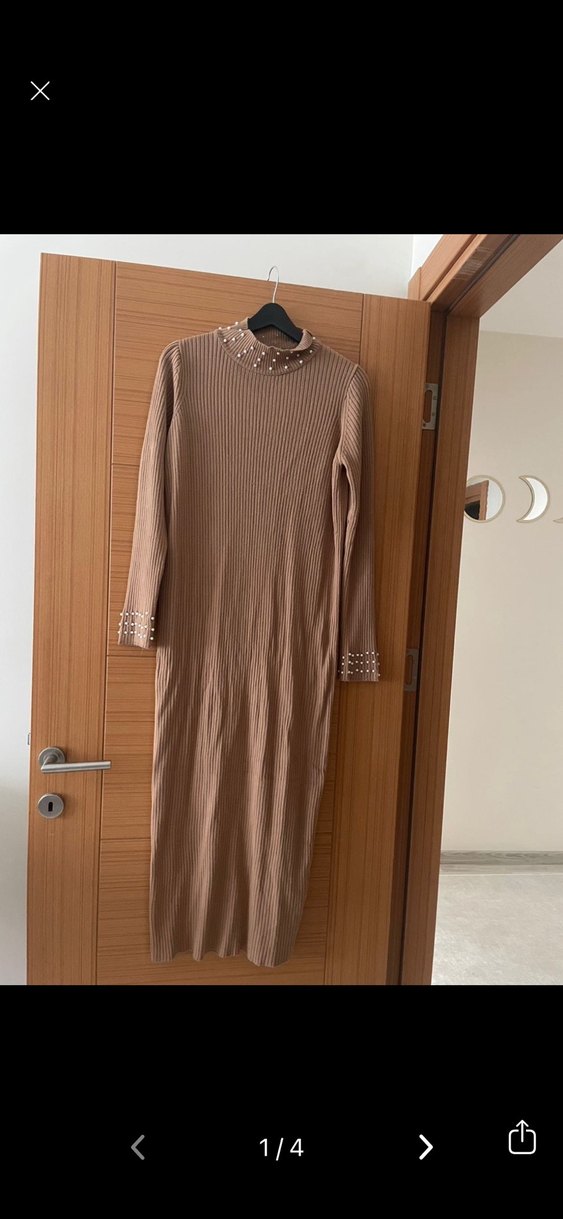 Bej renkte, inci detaylı yüksek yakalı ve uzun kollu triko uzun elbise. Rahat kesimli, sade ve günlük kullanıma uygun sıcak bir model. ✨