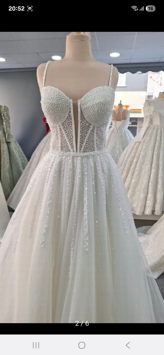 V yaka ve ince askılı, inci detaylı beyaz A kesim gelinlik. Fitted üst kısmı uzun etekle birleşir, modern ve şık bir seçimdir.