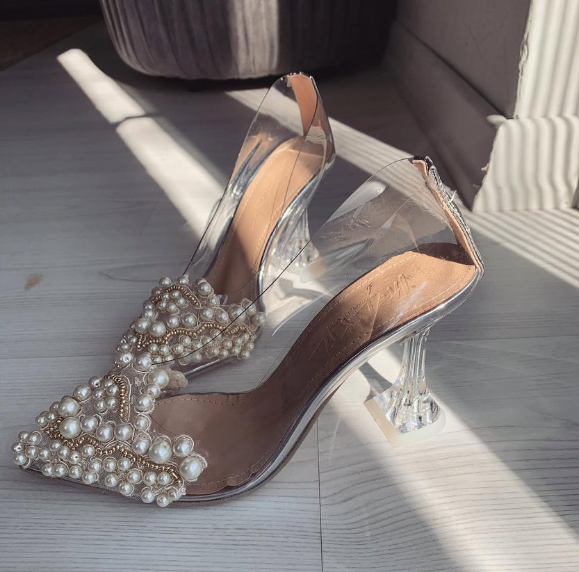 Beyaz cam topuklu, inci işlemeli klasik modern gelin ayakkabısı, şık ve zarif bir görünüm sunar. ✨