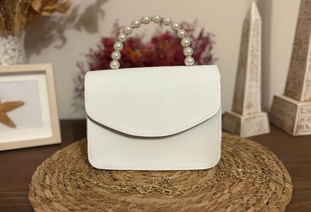 Hiçbir kusuru yoktur. Çok az kullanıldı. İnci detaylı kulpu olan beyaz deri kadın çanta, klasik zarafet ve bohem tarzı bir araya getirir. Düz yüzeylidir ve günlük kullanıma uygundur.