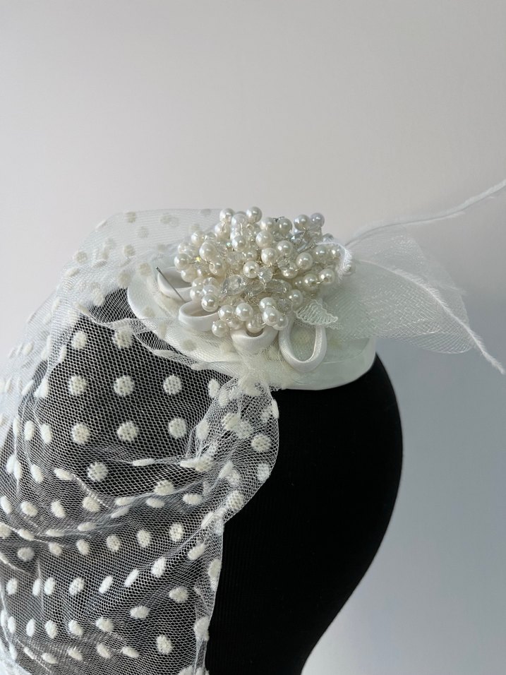 Beyaz, inci detaylı ve hafif puantiyeli tül ile klasik Paris şıklığını modern tarzla birleştiren düğün aksesuarı.