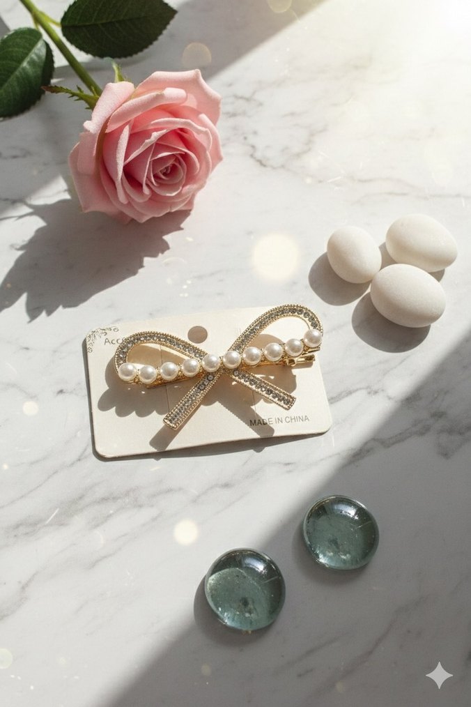 Cam incilerle süslenmiş beyaz fiyonk toka, modern klasik tarzda ve Paris şıklığını yansıtır.