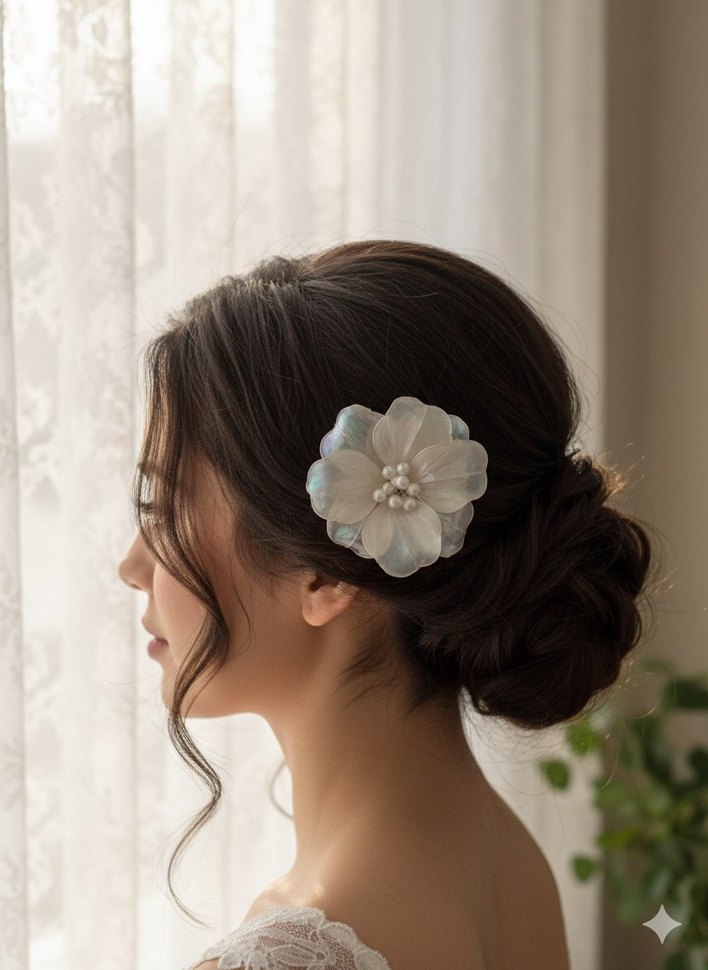 İnci detaylı, pastel tonlu beyaz ipek saç aksesuarı, klasik ve minimal bohem tarz için uygundur.