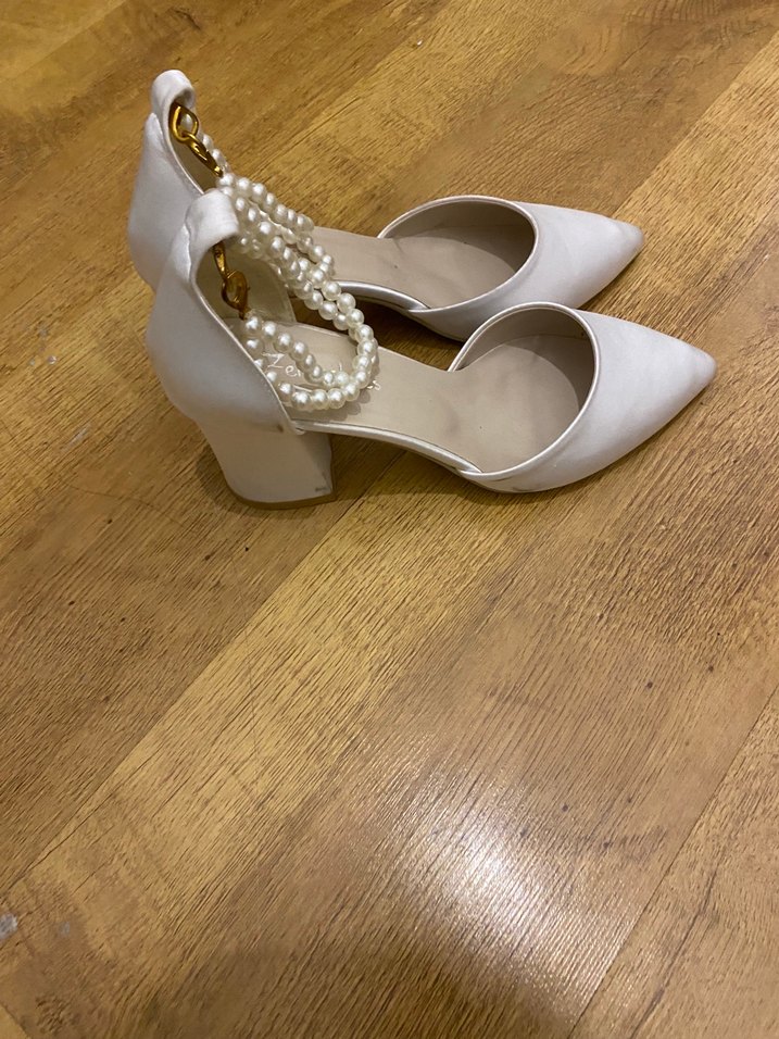 İnci detaylı, saten görünümlü beyaz kadın topuklu ayakkabı, klasik ve minimalist tarzda, düğünler için uygun. Nikahda giydim bir saat 38 numara