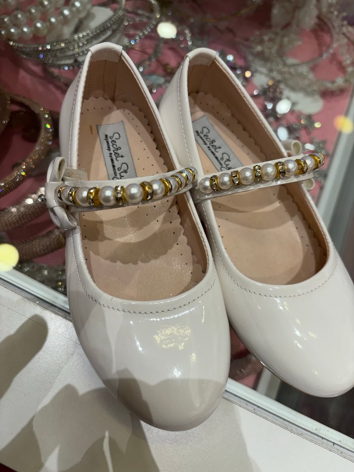 İnci ve altın boncuk işlemeli tokalı bantlı beyaz kız çocuk babetleri, modern klasik tarzda, pürüzsüz kauçuk malzemeden üretilmiştir.