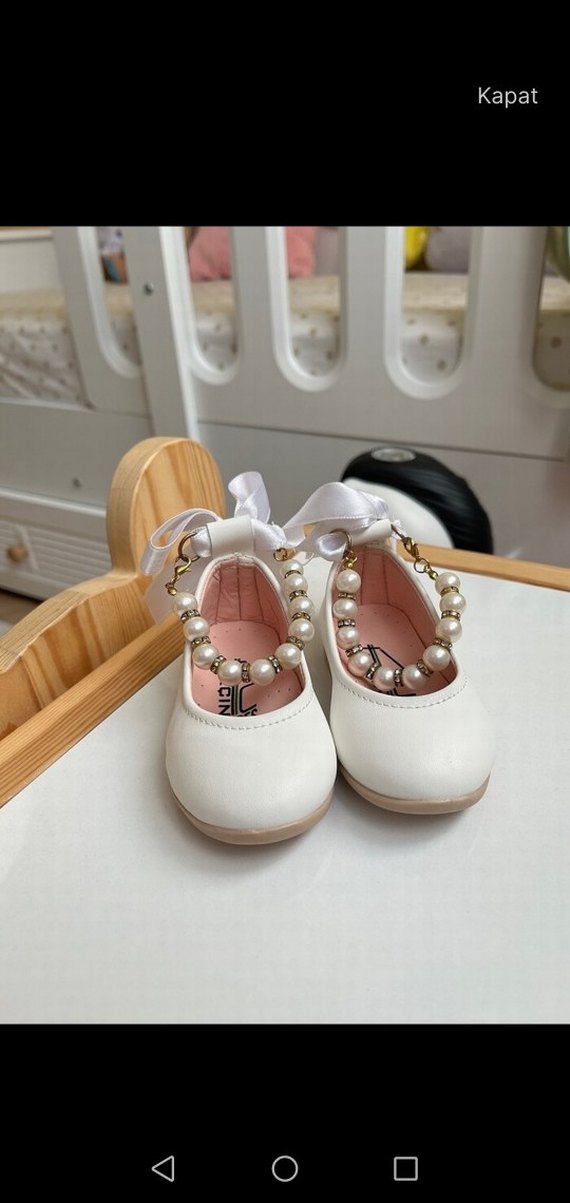 İnci detaylı bantları ve yumuşak kauçuk tabanı ile modern klasik tarzda beyaz kız çocuk babeti 18 numara 17/18/19 a uygun
