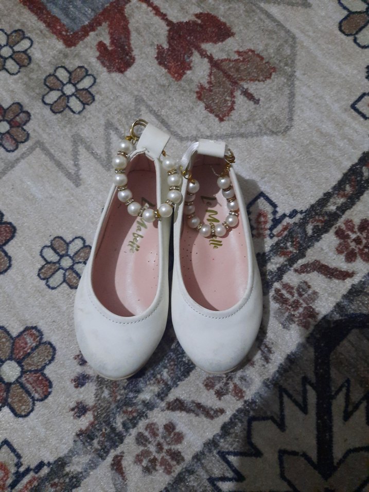 İnci detaylı bilekten bağlamalı beyaz kız çocuk babetleri, nakışlı ve rahat lastik tabanlıdır.