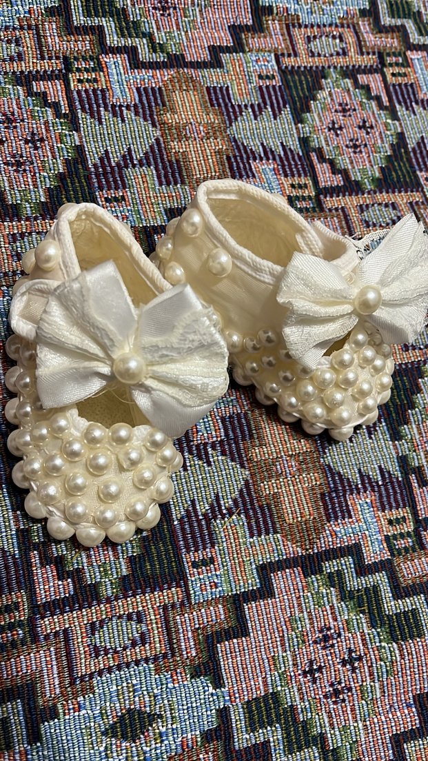 Beyaz örme kumaştan yapılmış, işlemeli desenli, inci boncuk detaylı ve büyük fiyonk süslemeli kız çocuk özel ayakkabısı.
