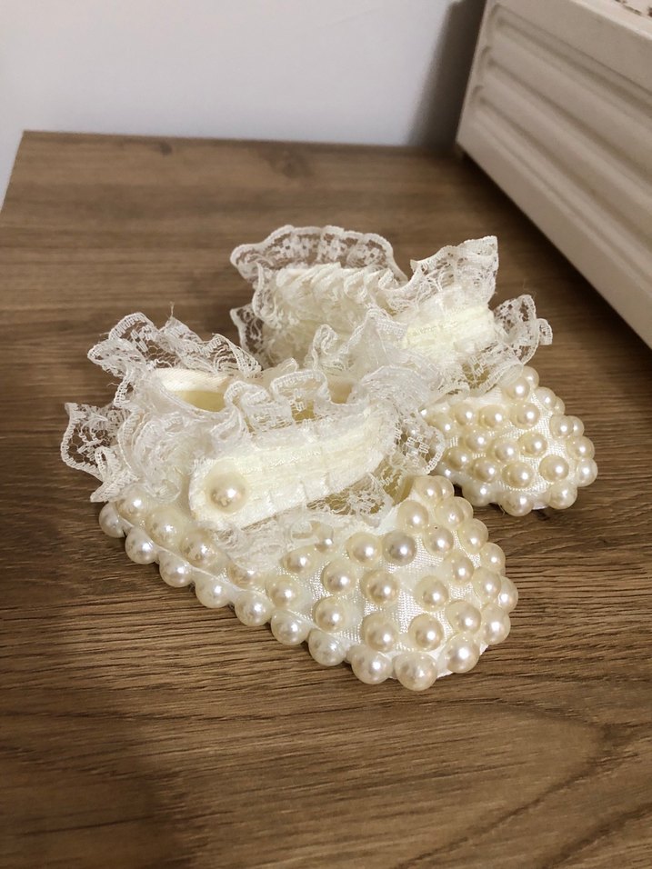 Dantel ve ince işlemeli inci detaylarıyla süslenmiş beyaz örgü kız çocuk ayakkabısı, klasik tarzda özel günler için uygundur.