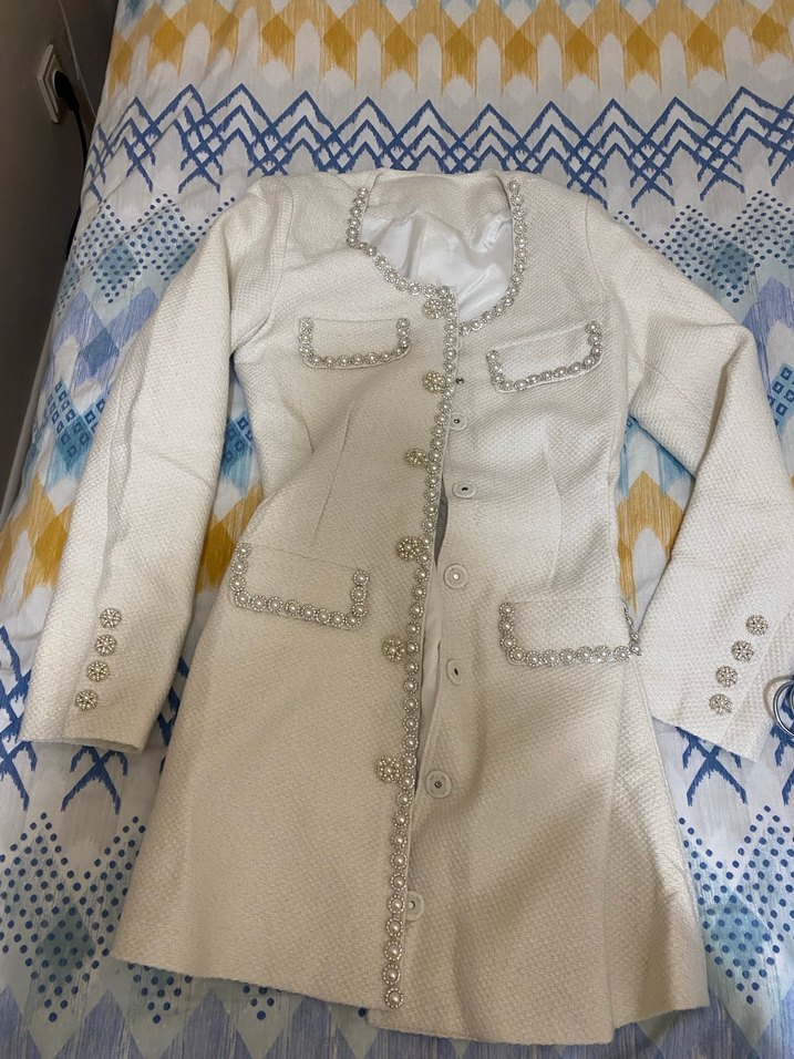 İnci detaylı, düğmeli beyaz midi uzunlukta kadın elbise Notlu yaka ve uzun kollu, nakışlı bohem tarzıyla günlük kullanıma uygun.