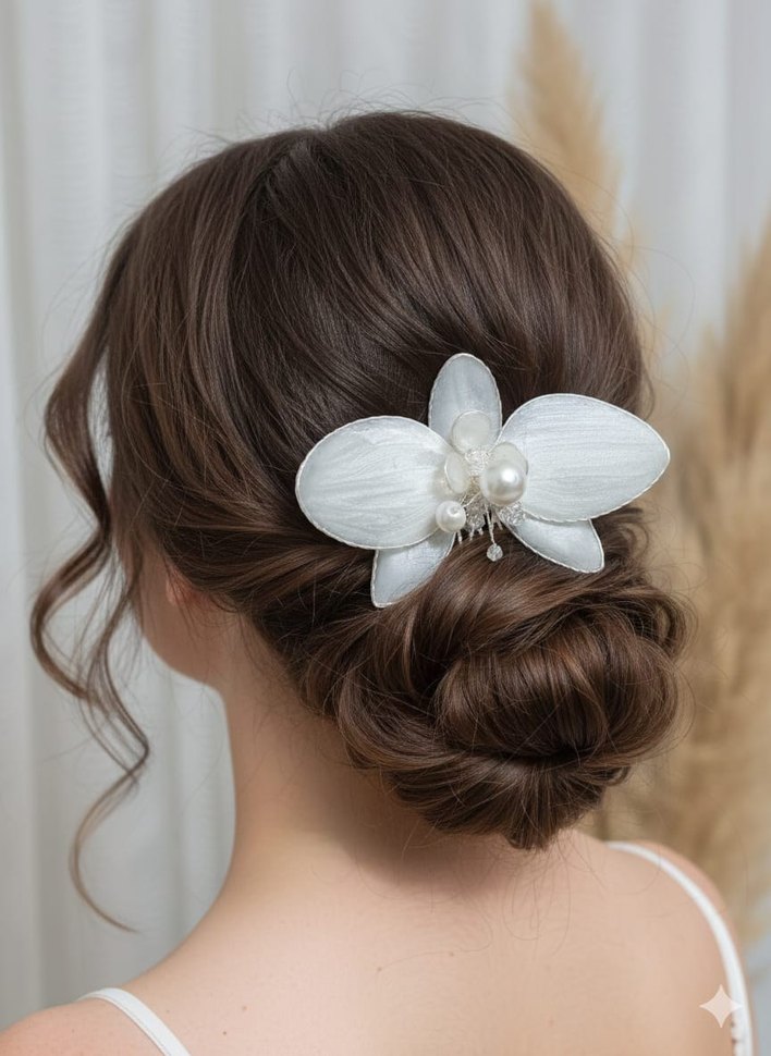 İpek gibi yaprakları ve boncuklu inci detaylarıyla beyaz saç tokası, zarif saç stilleri için modern klasik bir görünüm sunar. #gelintacı
