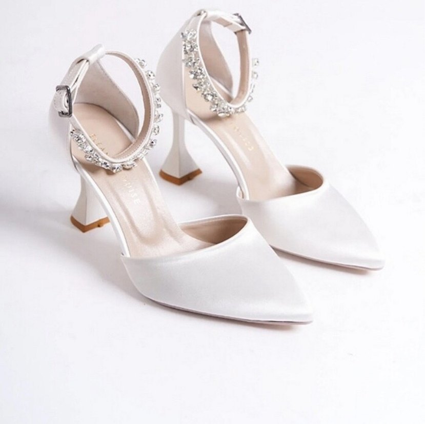 İnci detaylı bilekten bantlı, ipeksi beyaz stiletto topuklu ayakkabı, düğünler için uygundur.