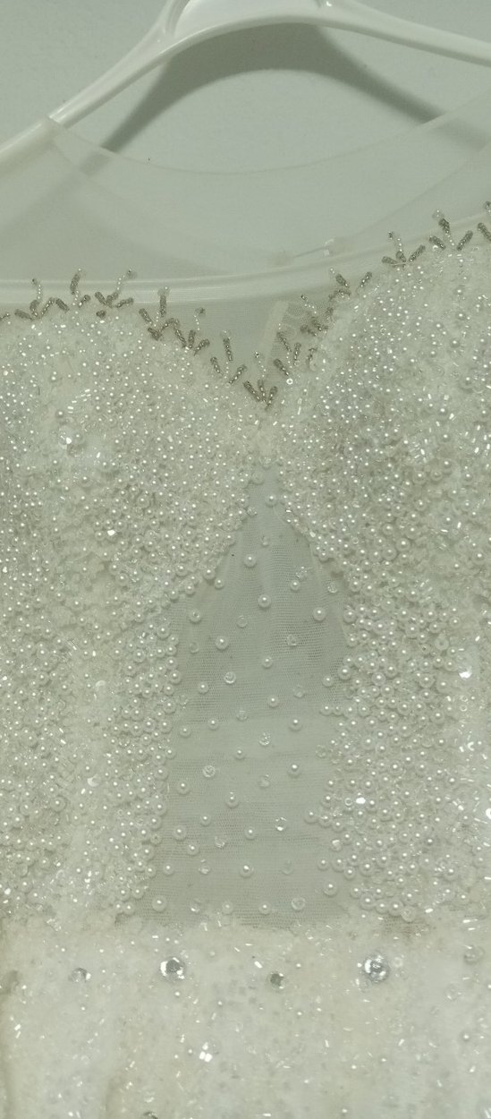 Fitted kesim, uzun boylu denizkızı gelinlik, straplez yaka ve parlak inci detaylarıyla göz alıcı bir tasarım sunuyor.