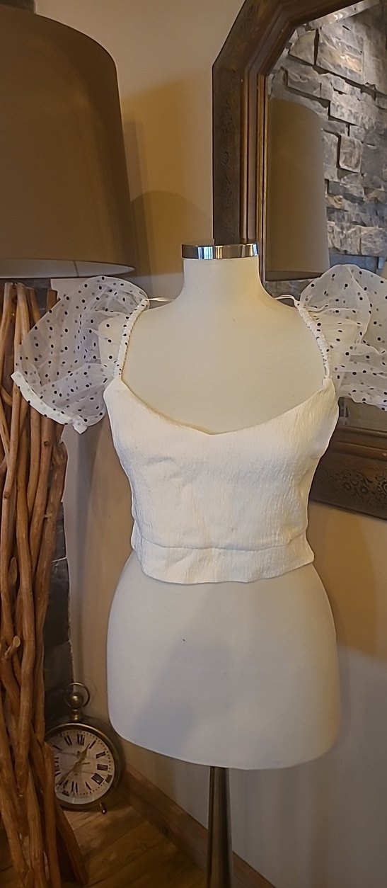Beyaz, straplez yakalı, kısa ve şeffaf puantiyeli puff kollu mini bluz. Nakış ve inci detaylarıyla bohem ve Paris tarzını yansıtır, düğünler için uygundur.
