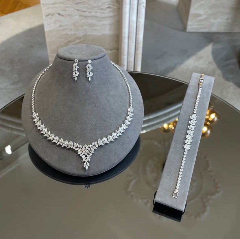 Beyaz takı seti, yaprak desenli işlemeli ve payetli detaylarla süslenmiş kolye, küpe ve bileklikten oluşur. HARİKA DÜĞÜN SETİ 1-2 saat KULLANILDI MARKA ÖYLESİNE SEÇİLMİŞTİR