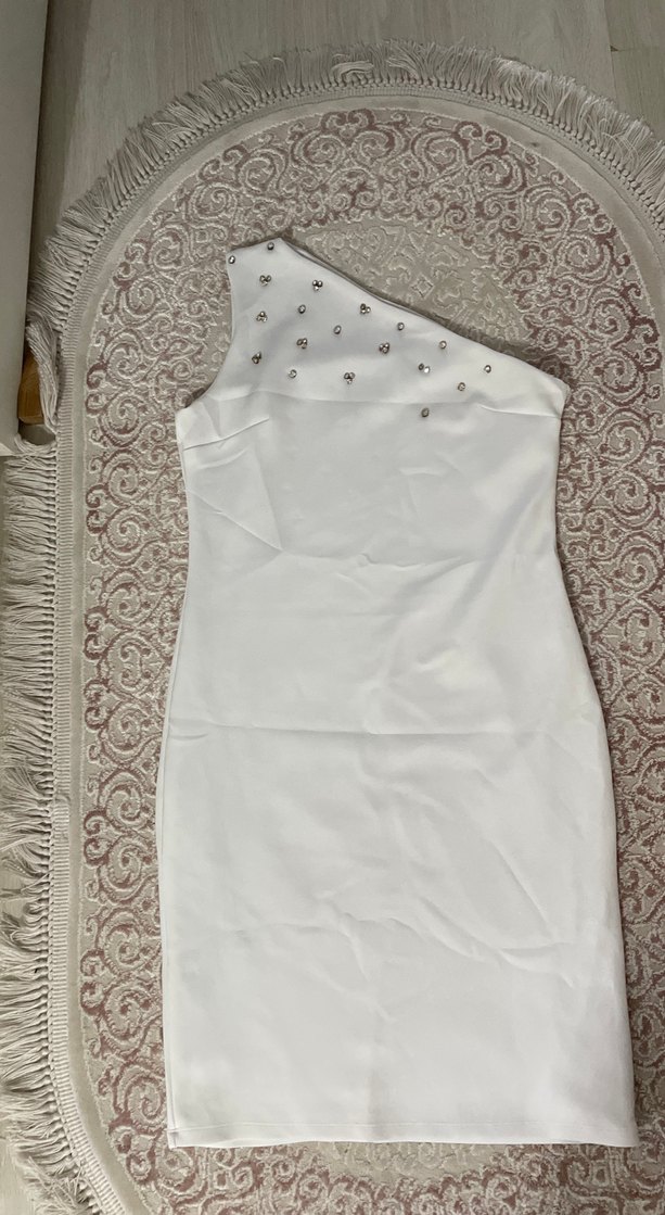 İnci Detaylı Beyaz Tek Omuz Abiye Elbise
