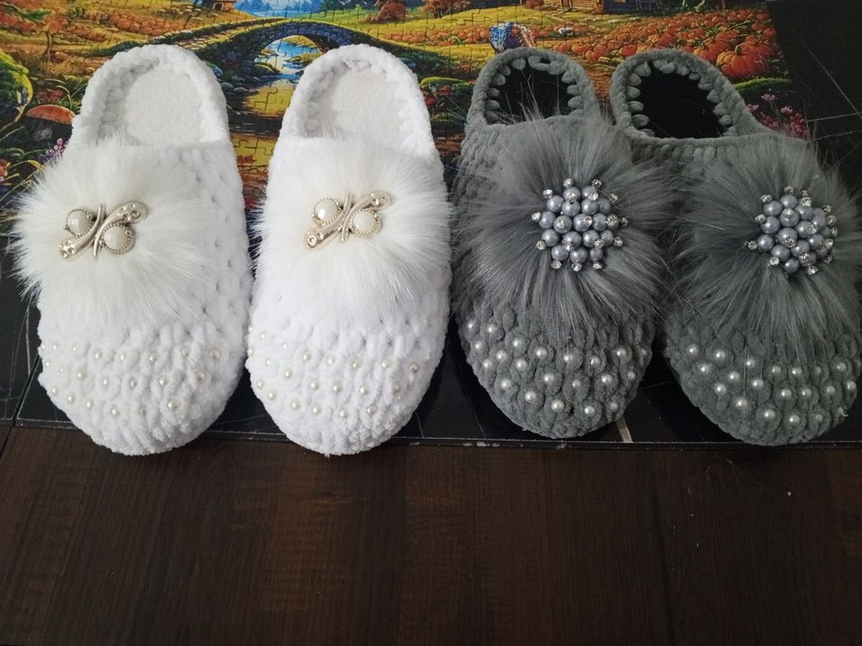 Beyaz triko kumaştan yapılmış, kürk detaylı ve işlemeli inci süslemeli kadın terlik. Yüksek topuklu, düğünlere uygun şık ve rahat bir model.