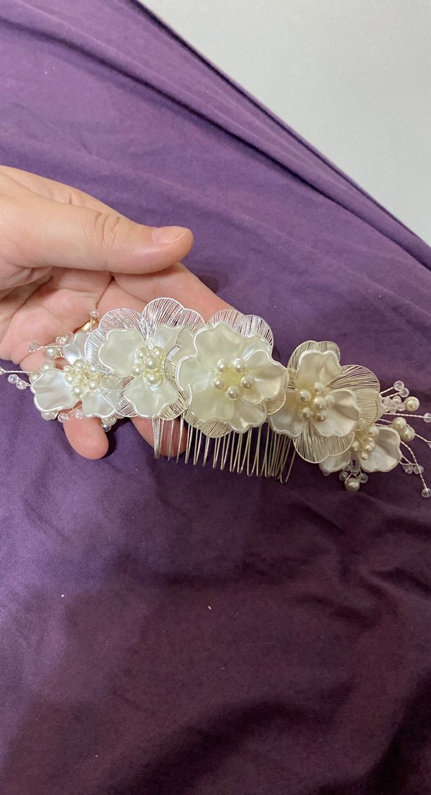 İnci detaylı beyaz çiçeklerden oluşan vintage tarzda, klasik ve zarif görünümlü saten saç tokasıdır.