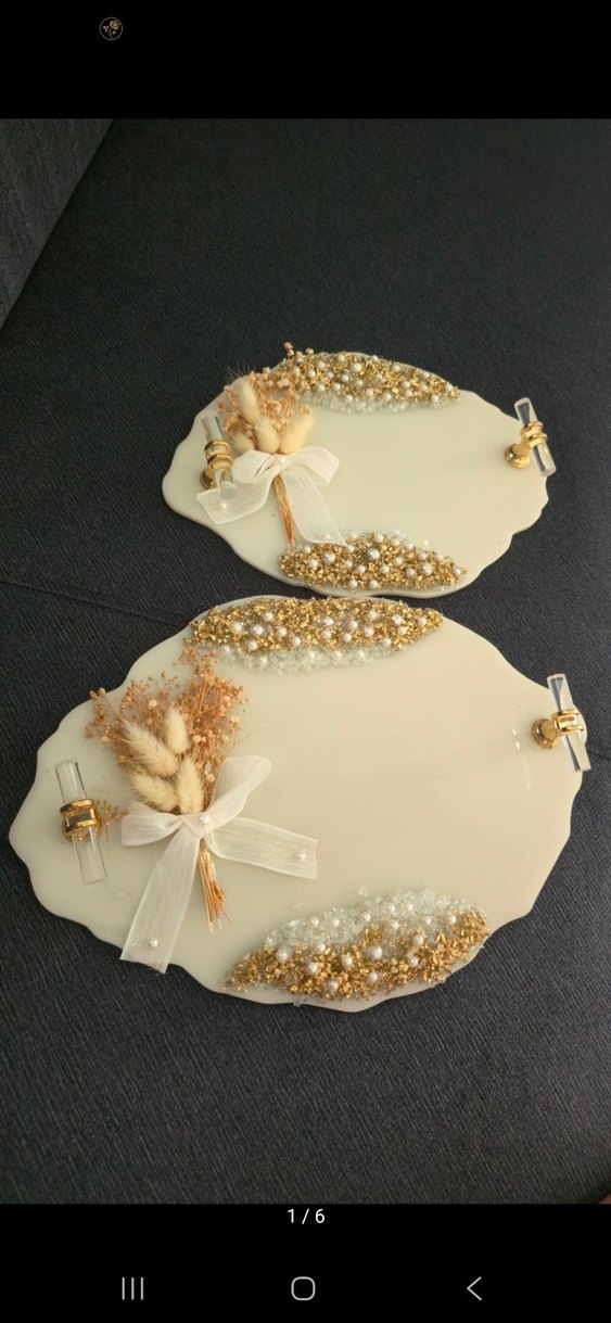 Ekim'de olan sözüm için almıştım. Epoksi tepsidir. Gördüğünüz tüm süslemeleri kendim alıp, yaptım. Daha sade bir tepsiydi. Hiçbir eksiği yada kusuru yoktur. İnci ve taşlar tek tük dökülme yapıyor sadece o da silikonla yapıştırıldığı için. Bana geldiğinde hep dökülmüştü telafi ettim. İkili set olarak satıyorum. Fincanı ve lokumluğunu yanında hediye ediyorum. Fincanın üst kapağında ufak çizikler var. Çok göze batmıyor. Tercihe göre değerlendirilebilir. Fiyatı çok düşük tuttum maliyeti daha fazla olmuştu. Pazarlık yoktur. Son fiyatdır. Şimdiden sahibine uğurlu gelmesi dileğiyle