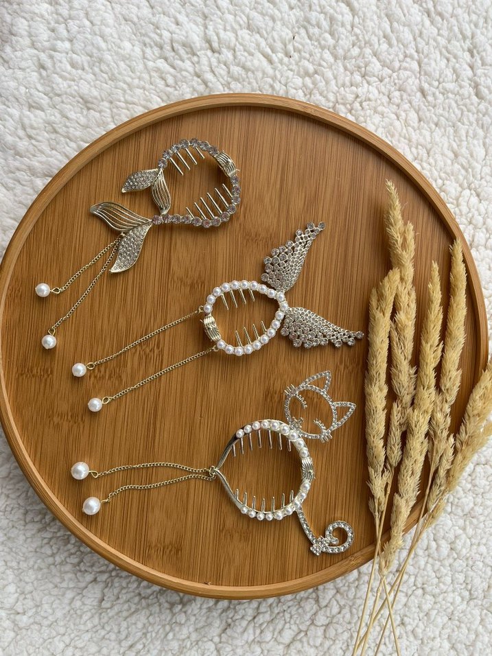 gümüş renkli, inci ve taş işlemeli kadın tokaları.